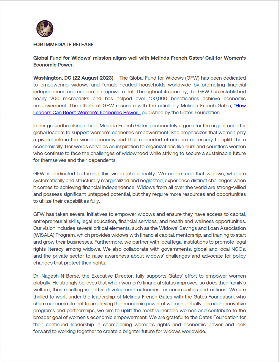 Press release: Global Fund for Widows' mission aligns well with Melinda French Gates' Call for Women's Economic Power